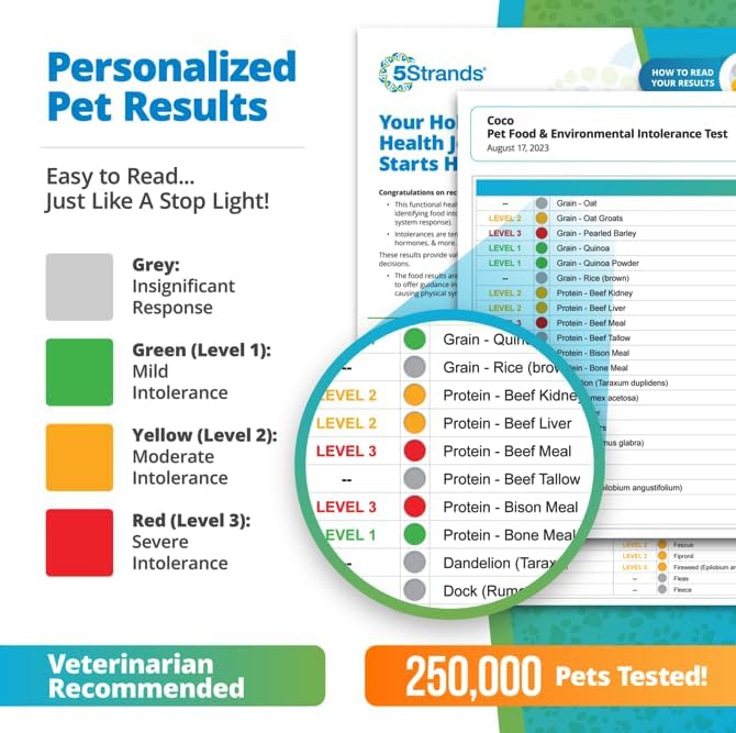 - Holistic Health for Dogs & Cats. Time to give your pet a voice. The 5Strands Pet Standard Package offers intolerance testing to 380 commercial pet food ingredients. Proteins, grains, additives, preservatives, fruits, seafood, meal, grass, chemicals, plants, fabrics, etc. The results will create an instant elimination guideline, identifying temporary imbalances, and saving you time and money!