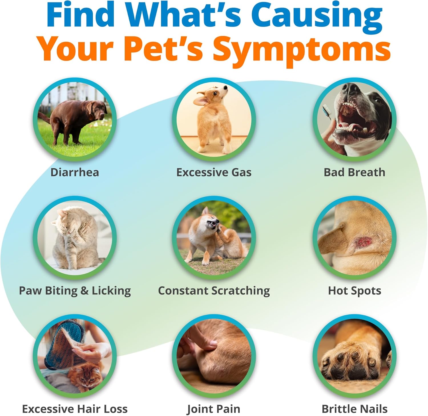 - FIND WHAT’S CAUSING YOUR PET’S SYMPTOMS. When your pet’s gut struggles to break down certain foods, absorb key nutrients, or reacts negatively to environmental stressors, it can cause symptoms like diarrhea, paw licking, hot spots, watery eyes, and fur loss. Because your pet can’t tell you what’s wrong, this at-home health and wellness test does.