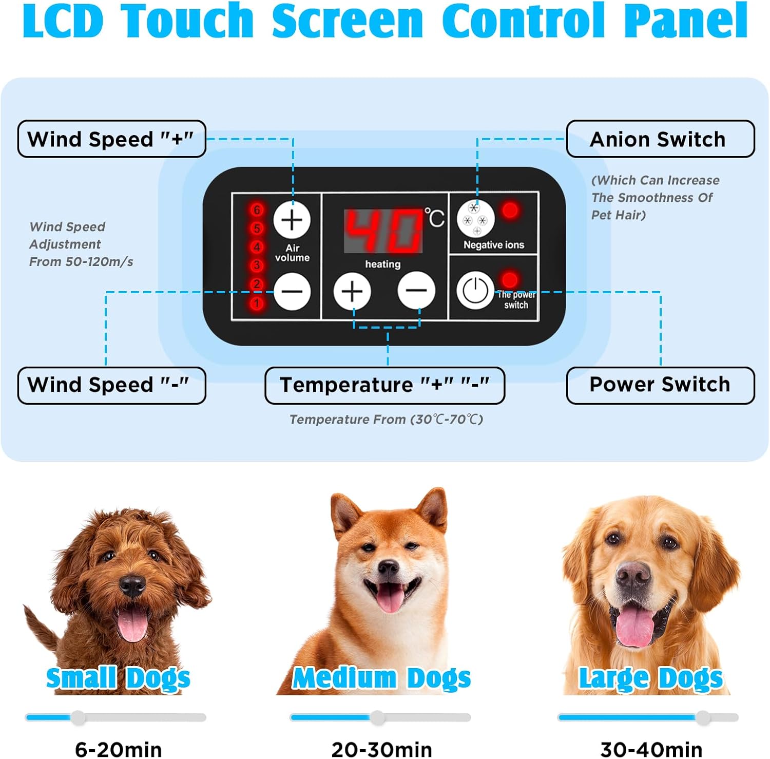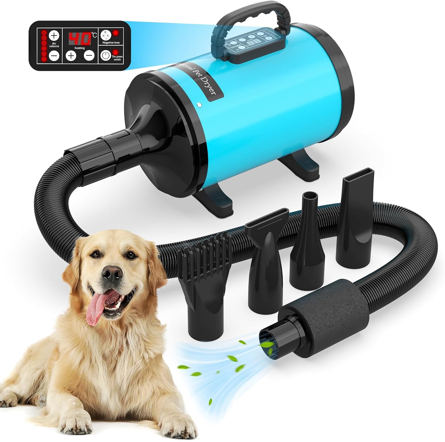 ADVWIN Dog Dryer, Pet Grooming Blow Dryer with LCD Display & Temperature Adjustable, 50-120m/s Adjustable Speed, 4 Different Nozzles, Blue