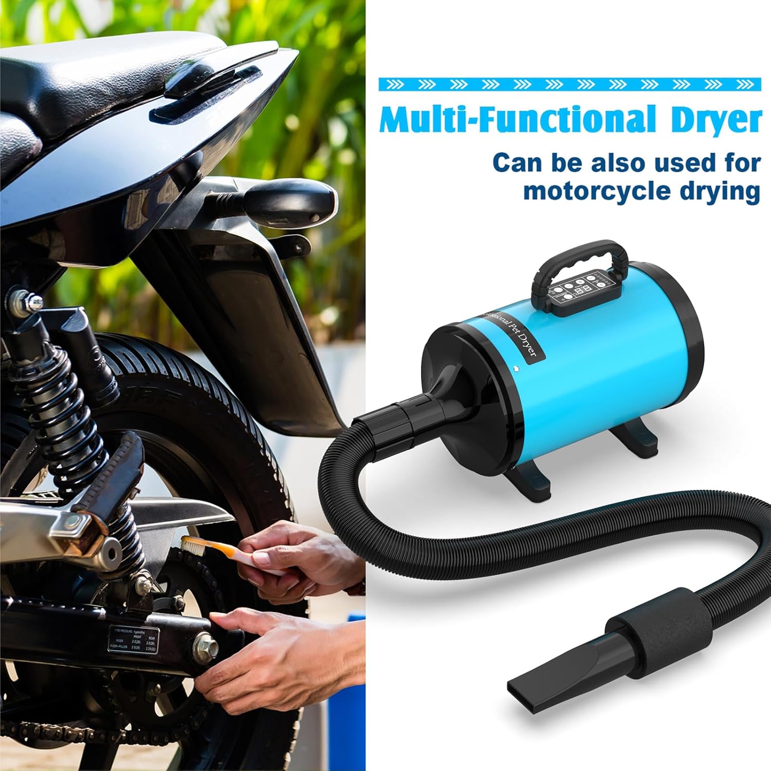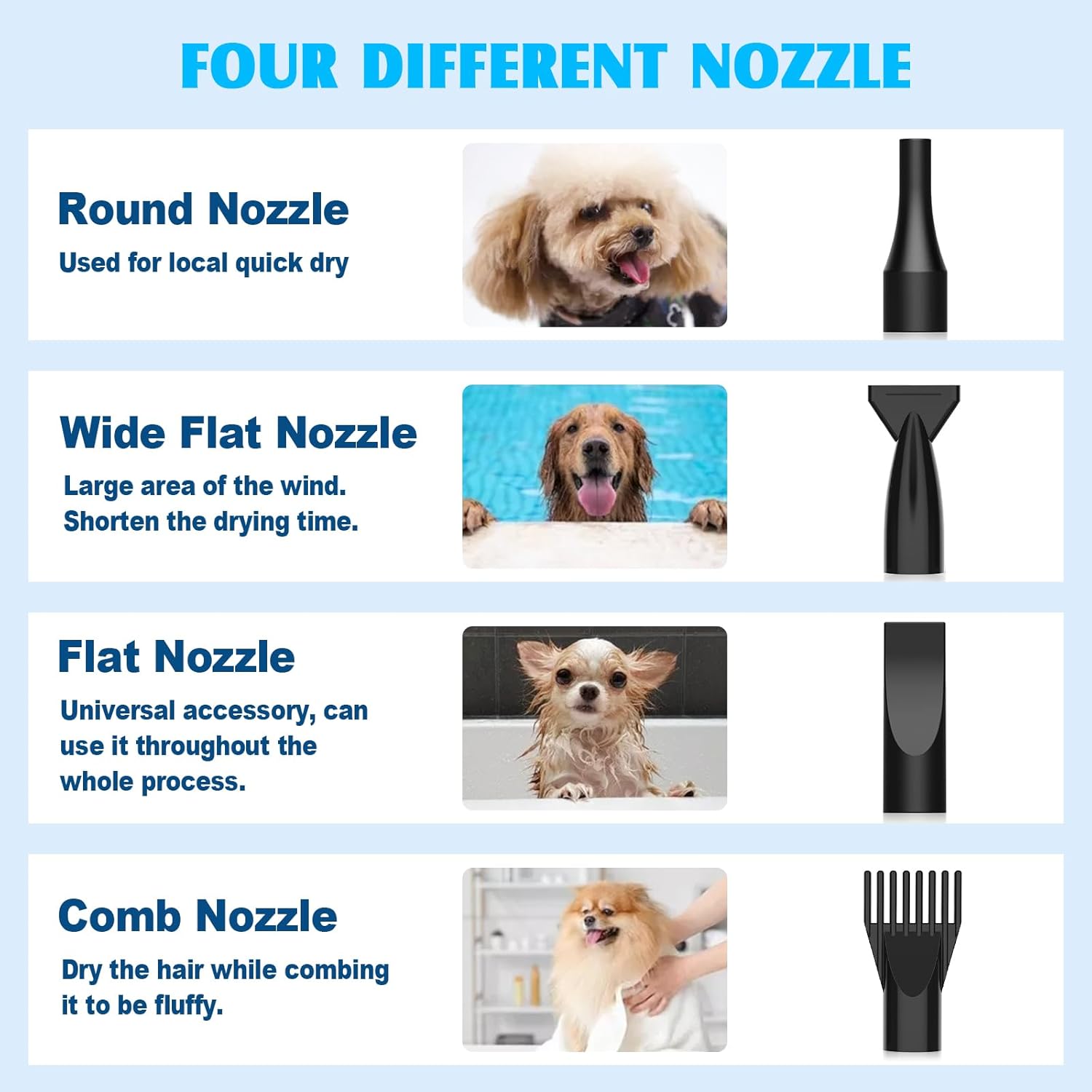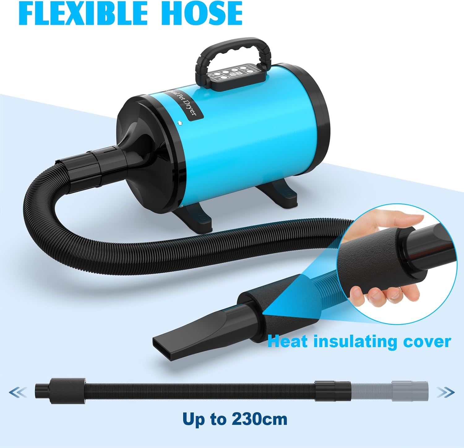 - 🐾【Protect Your Hands and Back】Length adjustable pipe can extend to a full 230cm and retract to no less than 76cm. You can quickly find the most suitable position and save your spine and joints. Thickened plastic pipe protects your hands from scald. Comes with 4 different nozzles so that your pets can enjoy a fully drying.