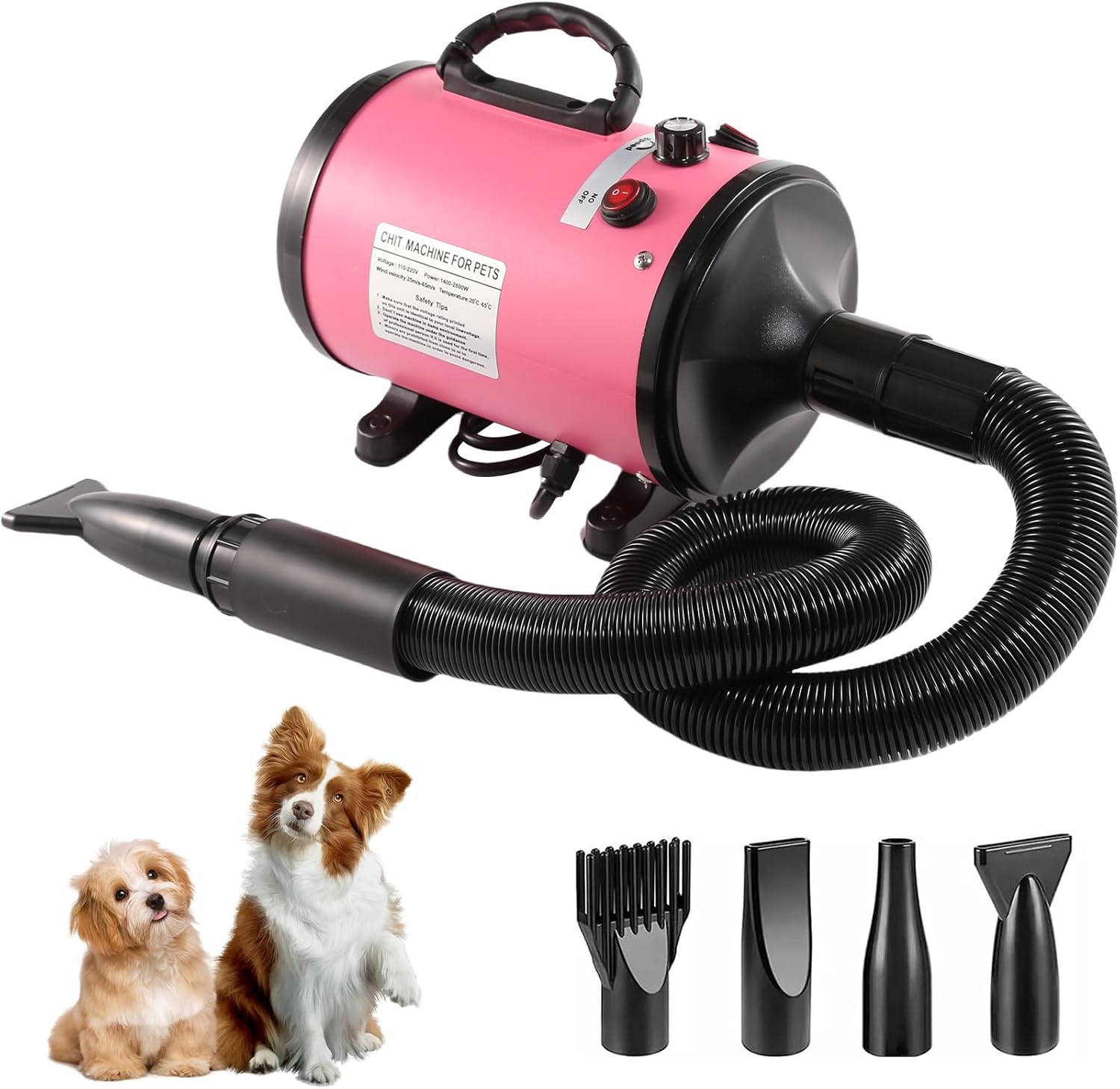 - With four different nozzles: the dog hair dryer has four different nozzle shapes that meet the different drying and care needs of different pets. Whether long-haired, thick-haired, curly or short-haired, tame your pet's mane with any hair dryer and give it a new look without having to buy additional products!