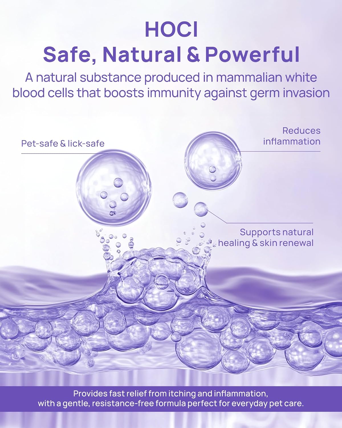 - Effective Relief for Hot Spots and Itching: HOCl effectively prevents the spread of inflammation through oxidation. It also modulates the local immune response to suppress excessive inflammation, quickly soothing hot spots and relieving itching, while reducing redness and discomfort. Additionally, it promotes the healing of minor wounds, making dog hot spot spray a versatile choice for pet care at home