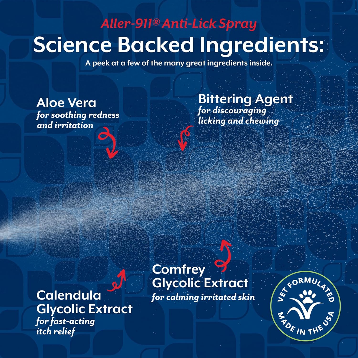 - Aller-911 anti-lick paw spray helps to soothe itchy paws and contains ingredients to discourage further licking.