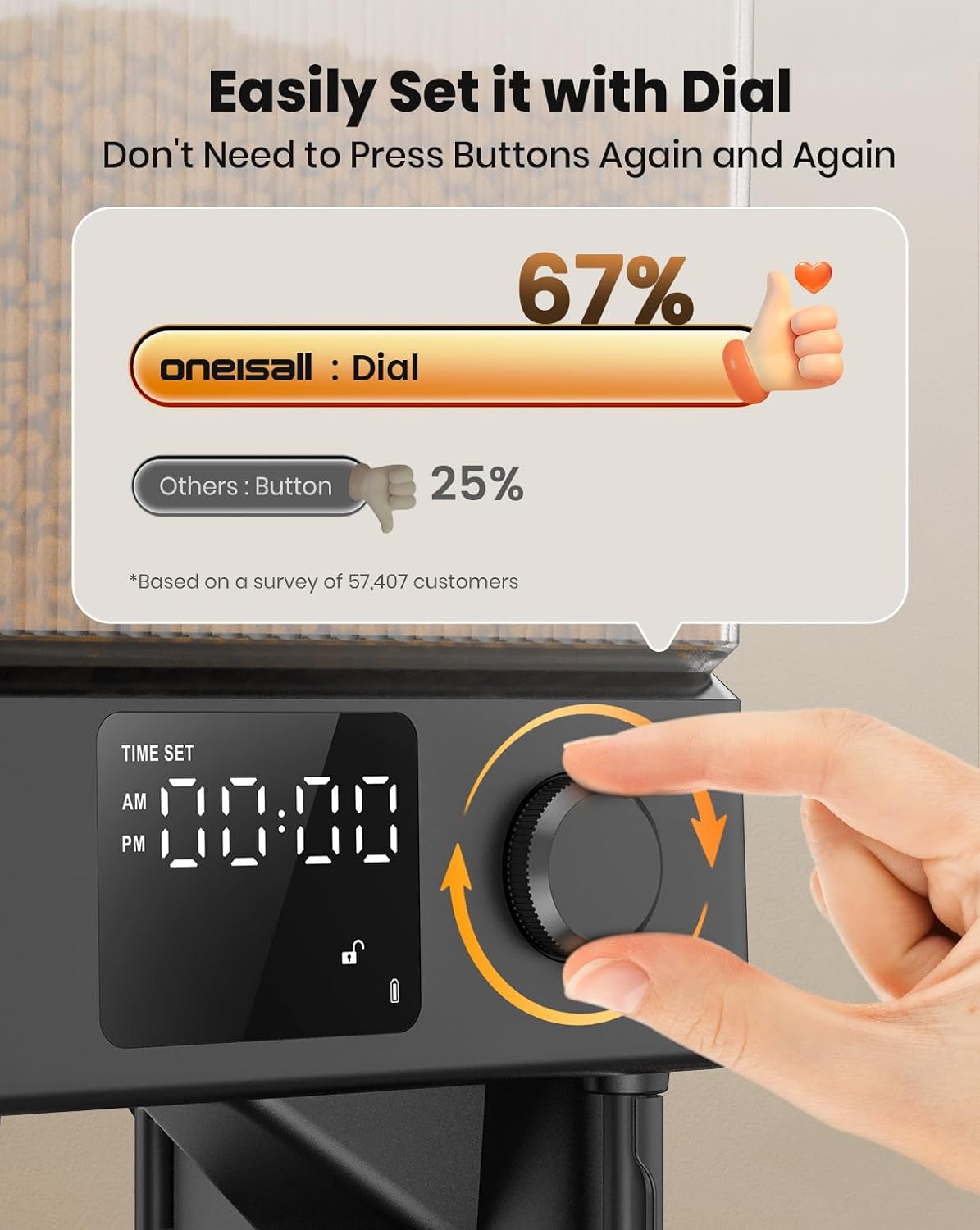 - oneisall Dial Cat Food Dispenser. To simplify the programme, we bring out this dial feeder this year. Based on the sound of our customers, they would like to get an automatic cat feeder which is easy to set.With a dial, you could feel the programme more controlable.Just like a mouse controls a computer.