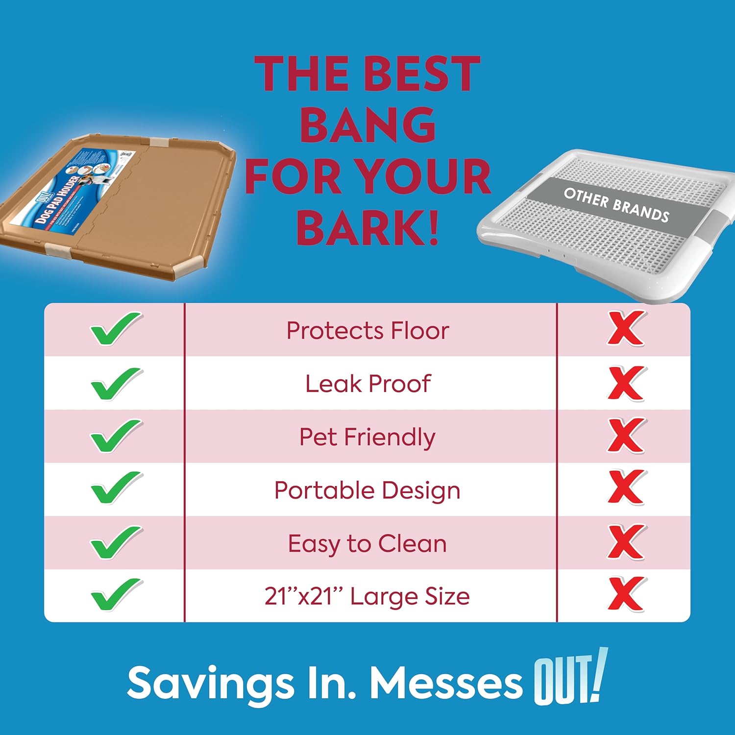 - INDOOR POTTY SYSTEM - The best indoor potty system for dogs yet, this dog pad holder tray has raised edges on all sides, keeping urine from flowing off the pad and onto your floors; This 21x21 tray is light and portable, making it easy to travel with!