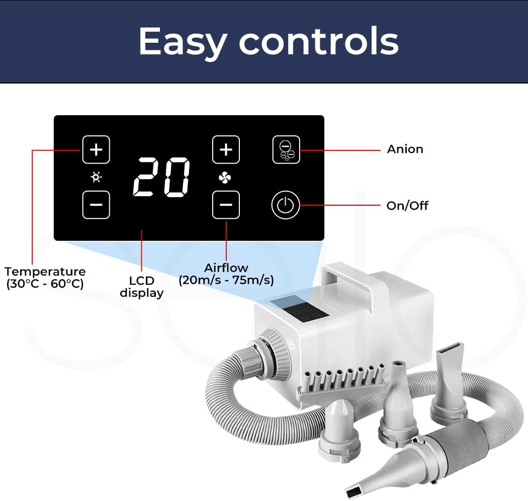 - 🌟Easy to Control: The large touch screen allows for heat control and airflow control, controlled airflow to protect your pet's fur, clean your furry dog, and then blow dry directly with the new anionic dog hair dryer. Faster drying means healthier dogs, especially long-haired dogs.
