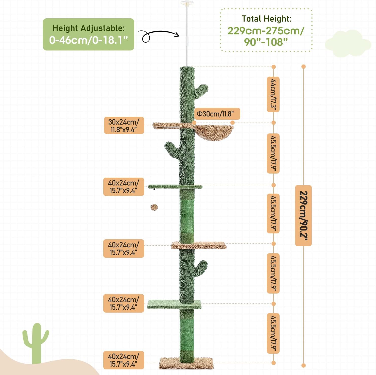 PAWZ Road Floor to Ceiling Cactus Cat Tree for Indoor Cats, Tall Cat Tower [229CM-275CM] Adjustable, Cat Climbing Tree with Cat Scratching Post, Hammock, Dangling Ball Toy,Green