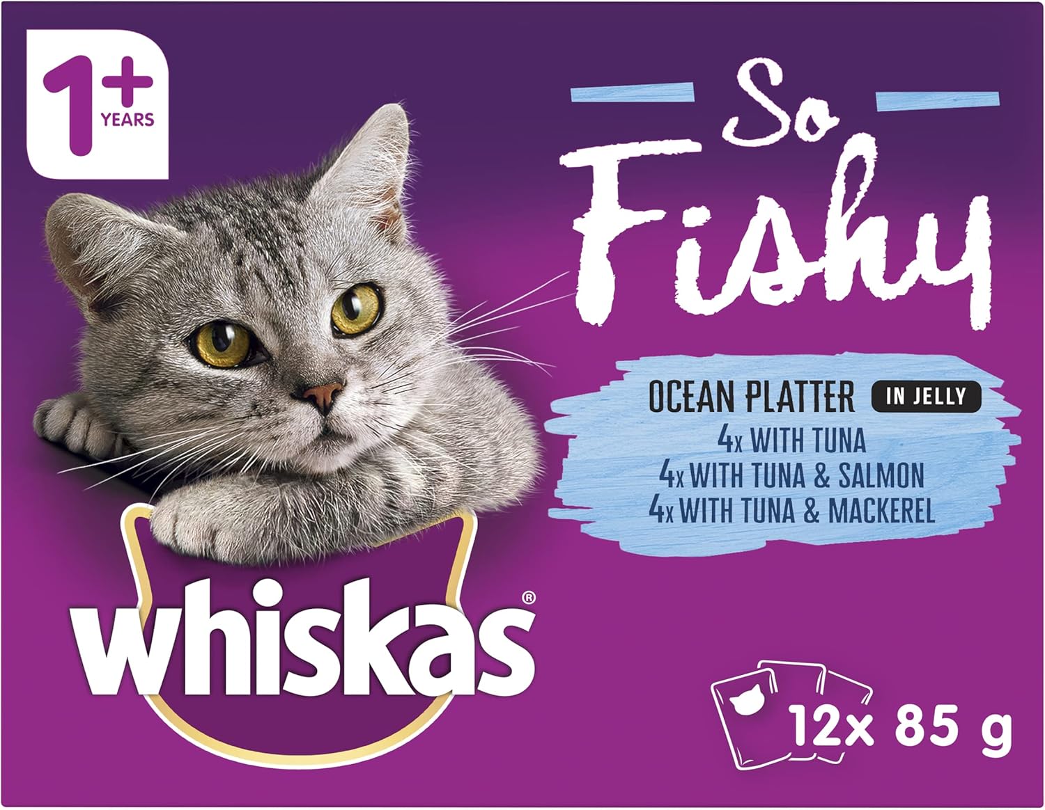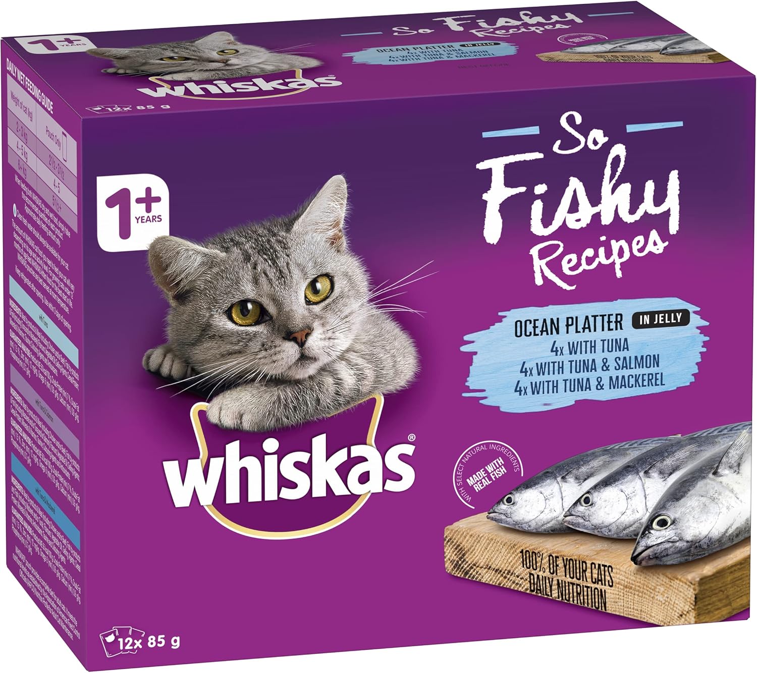 WHISKAS So Fishy Recipes 1+ Years Wet Cat Food Ocean Platter in Jelly 12 x 85g, 5 Pack (60 Pouches)